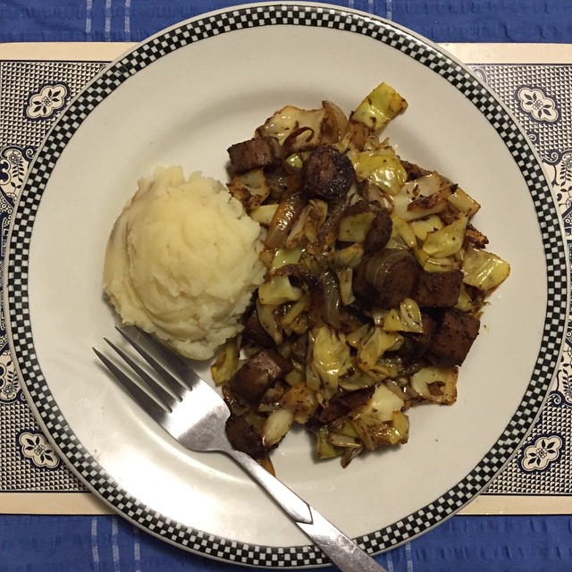 When the cabbage has just started to soften and most of the water is gone, add the sausages.