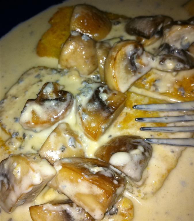 To serve, place several slices of polenta on each plate, scatter with the cooked mushrooms and then pour over the warm blue cheese sauce.