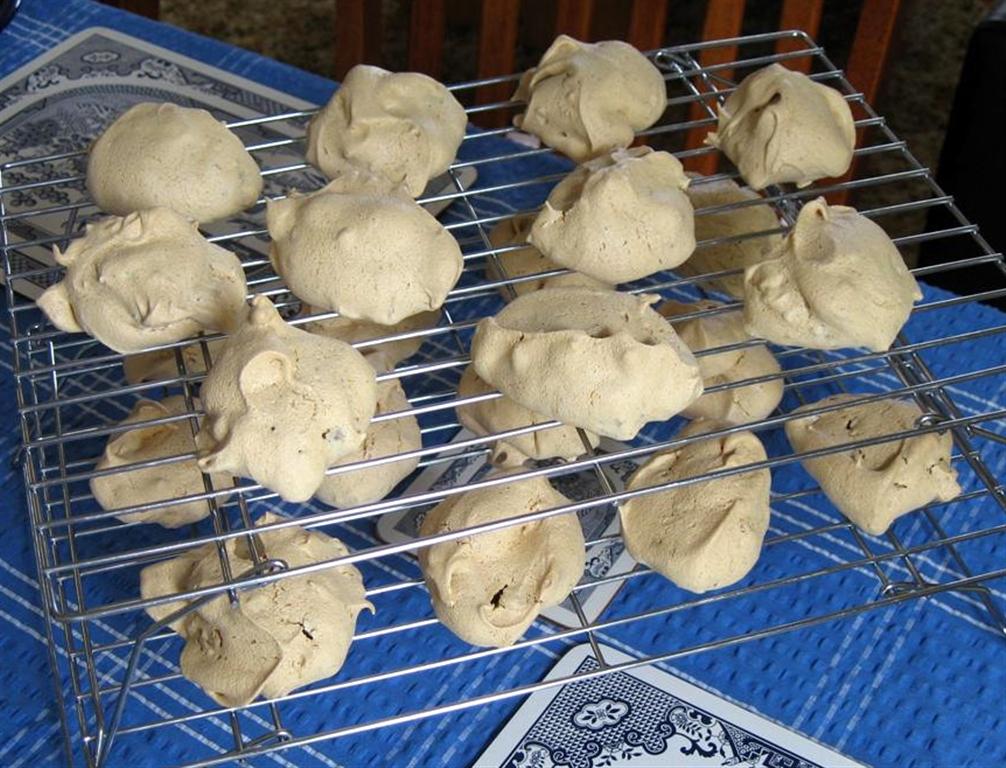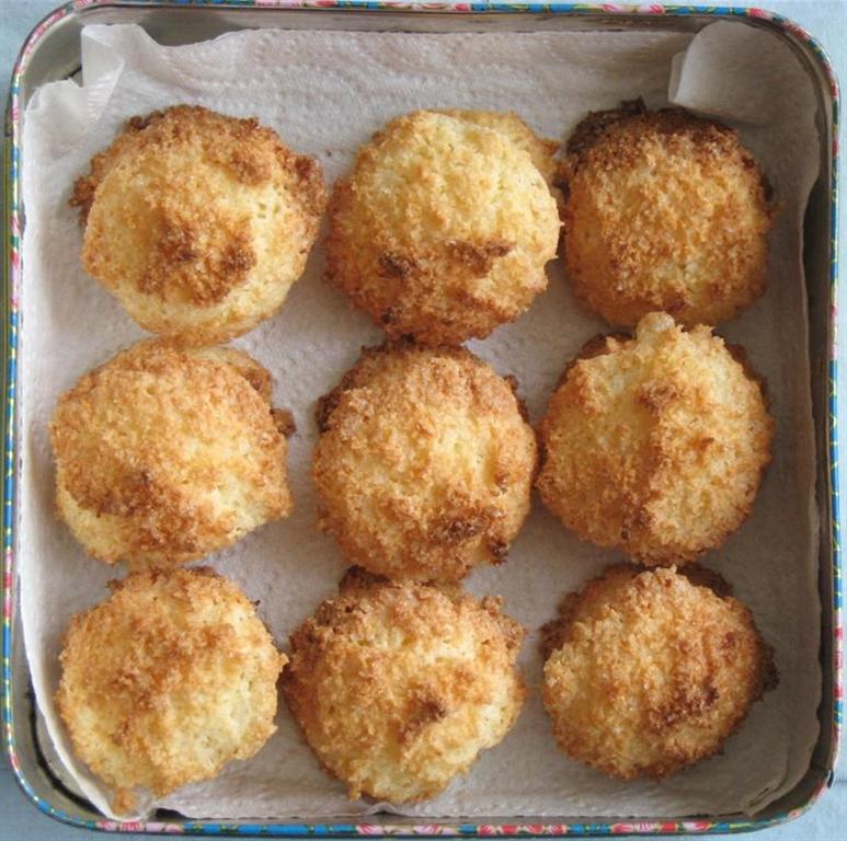 Place heaped teaspoonfuls of mixture on to greased and cornfloured oven tray (or tray covered with baking paper), press mixture lightly into peaked macaroon shapes. Bake in moderate oven (180°C) for 15 minutes or until light golden brown. Remove from oven, loosen on tray immediately, allow to cool on tray.